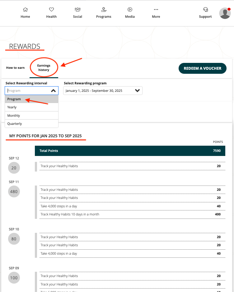 - To see your points earned from Jan. 2025 to Sept. 2025 go to “Earnings history” > Select Rewarding interval > Program